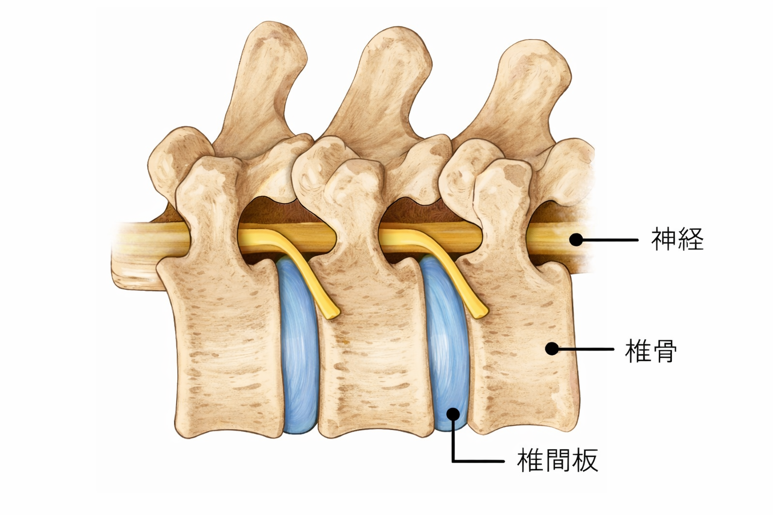 背骨は、椎骨と呼ばれる骨が連なった構造をしており、椎骨と椎骨の間には椎間板と呼ばれるクッションのような組織があります。椎間板ヘルニアとは、椎間板が変性を起こして硬くなり、本来の位置から突出・逸脱して脊髄神経を圧迫する疾患です。神経が圧迫されると痛みや麻痺などの症状があらわれます。頸部や胸腰部で発生し、発生部位や重症度によって症状や治療法が異なります。