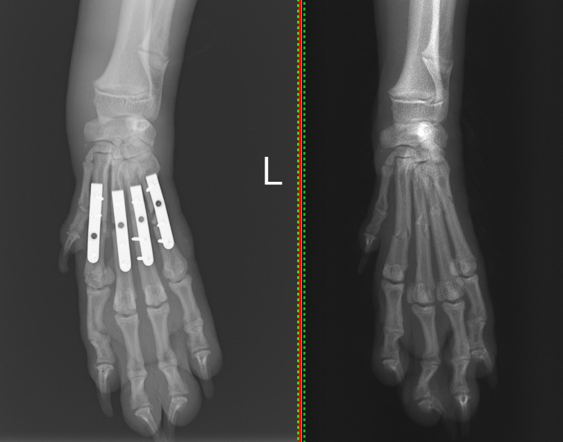犬の中手骨骨折(1.1mmプレート使用) 左:術後/右:術前