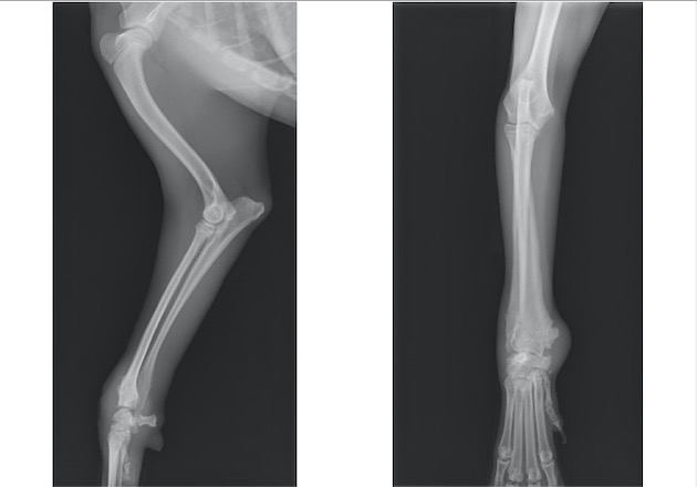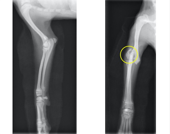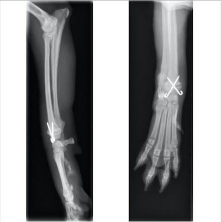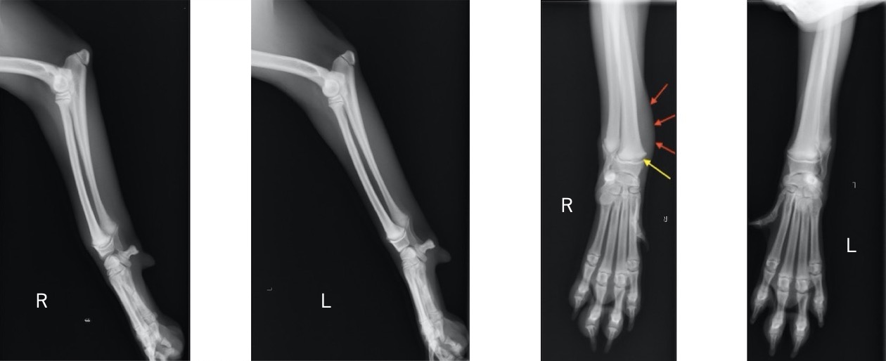 単純X線画像検査上、側面像では大きな左右差は認められませんでしたが、背掌像にて右前肢の軟部組織の腫脹と成長板の間隙が広くなっていることから橈骨遠位成長板骨折(Salter-Haris Type1)と診断し、外科的処置を行いました。 初心時のX線画像検査初見 赤矢印:軟部組織の主張、黄矢印:橈骨遠位成長板(左前肢と比較すると、成長板の隙間が広くなっております)