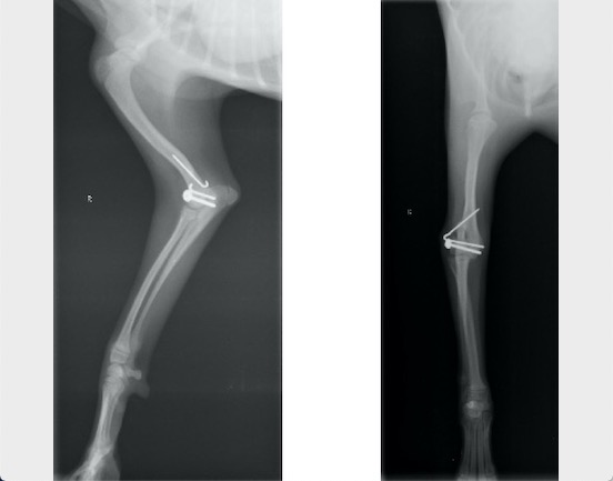 術後約1ヵ月後 挙上が認められなくなり、患肢に負重をかけて歩行ができるようになったため、キルシュナーワイヤーを抜去しました