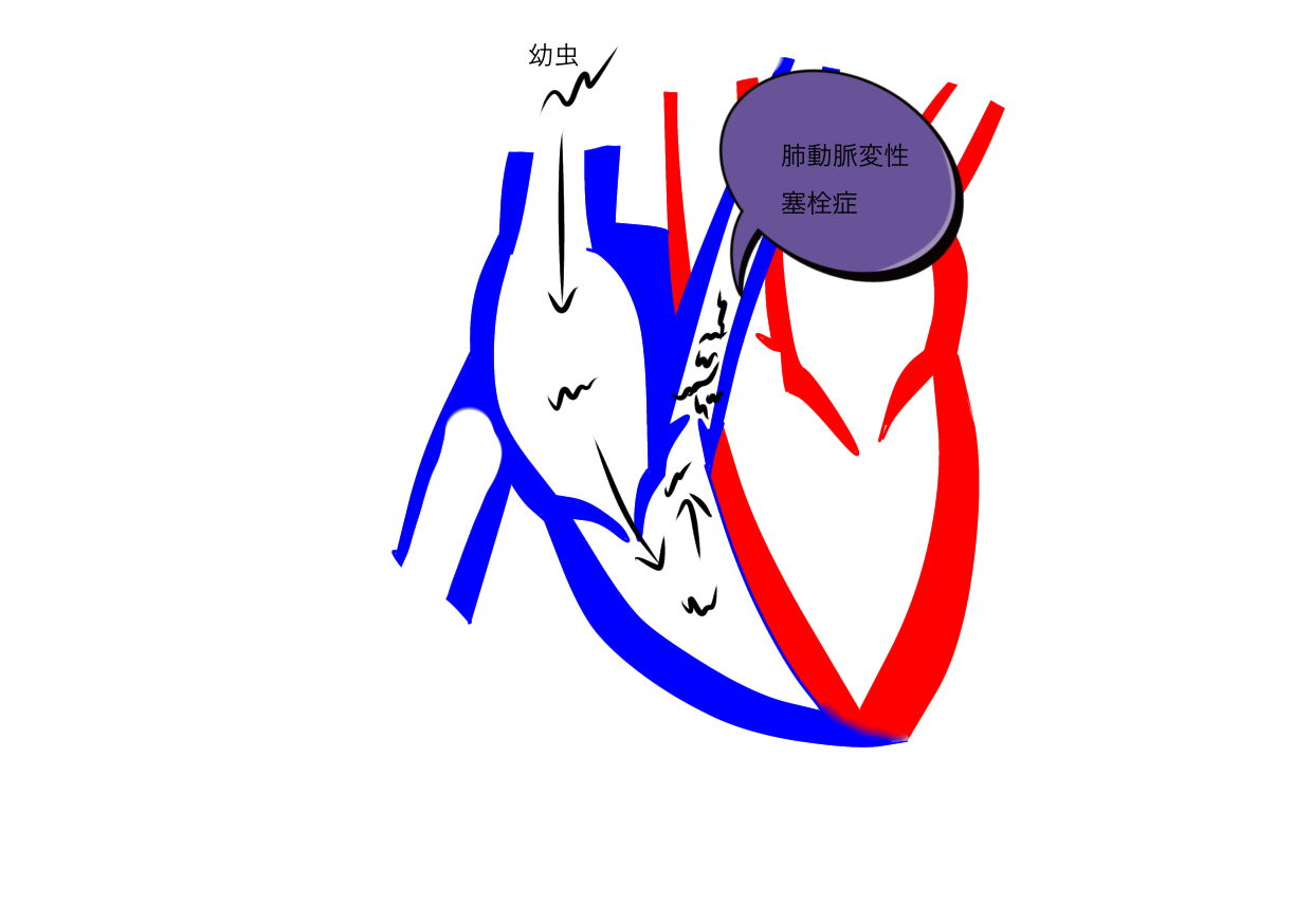 犬の体内に侵入した幼虫は皮膚の下や筋肉の中などで脱皮したあと静脈血管内に再度侵入し、心臓を通って肺動脈に寄生して成虫になり、新たな幼虫を産出します。