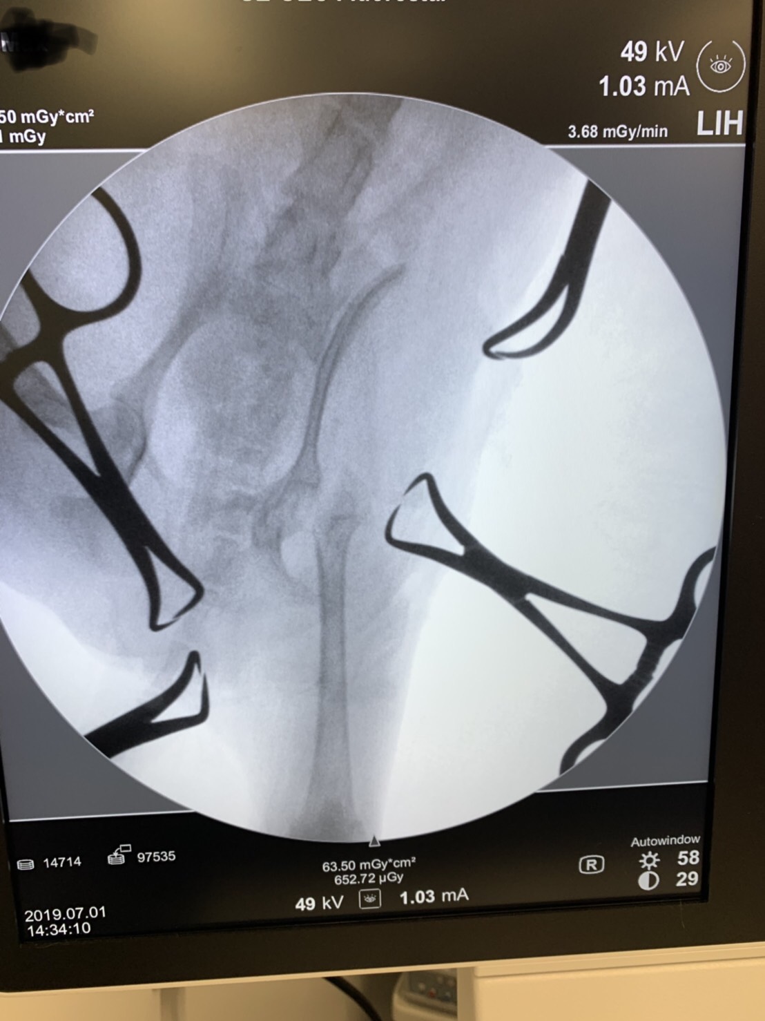 術中、骨頭・骨頚部切除後。Cアームという特殊なX線装置を使い、切除ラインが適切かどうかを確認します