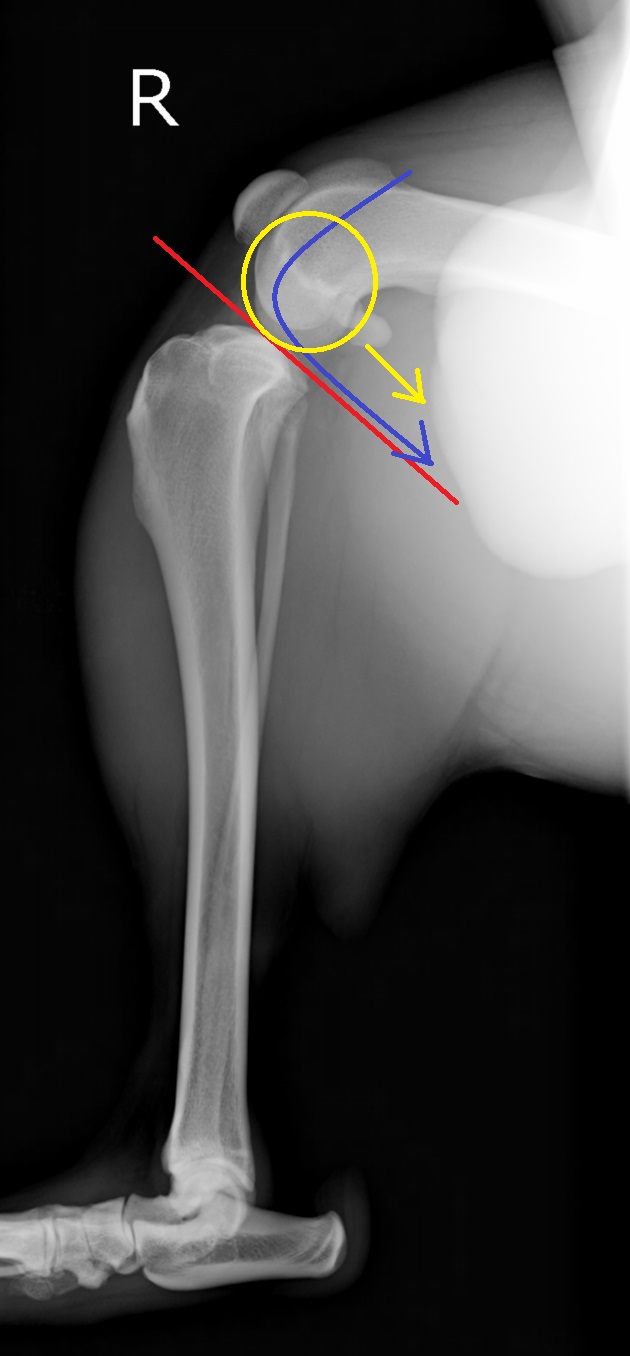 赤直線が脛骨高平部角、青・黄色矢印は大腿骨が滑り落ちてしまう力のベクトル