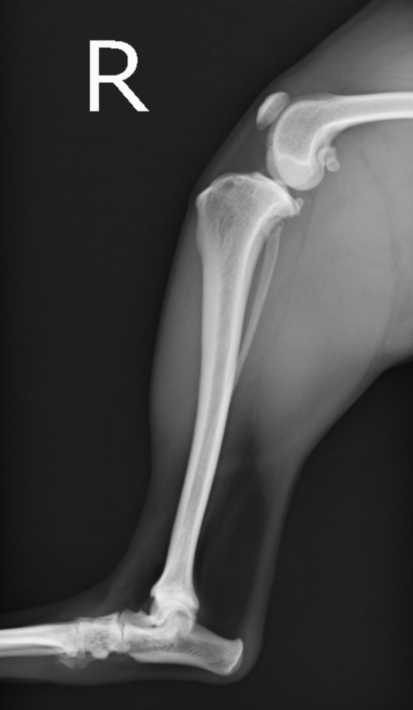 正常肢。大腿骨と脛骨の位置関係が前十字靭帯損傷時と異なり、しっかり連絡性がある