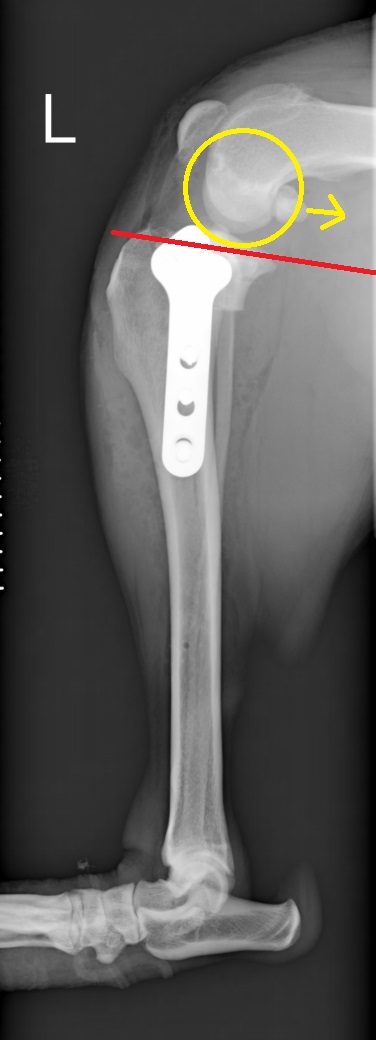 近位骨片を回転させて金属インプラントで固定し、脛骨高平部角を減少させることで、大腿骨が後ろに滑り落ちる力を無くし、前十字靭帯機能が消失した膝関節の動的安定化を図ります。