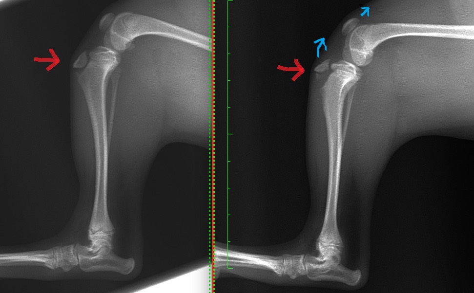 成長期ではまだ完全に骨化していないのでX線では周囲が黒く抜けて見えていますが、写真右側の患肢は骨折があるため大腿四頭筋群や膝蓋靭帯の強い力で引っ張られ上方に変位(水色矢印)してしまっているのが分かるかと思います。