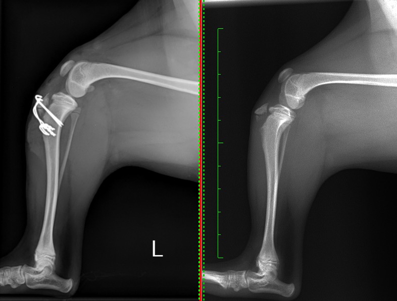 急性期の疼痛は時間経過とともに治まってきますが、この状態で放っておくと脛骨粗面や膝蓋骨が変位した状態で安定してしまい、二次的な膝蓋骨脱臼・関節炎、膝関節の可動域制限などの症状が出てくることが考えられたため、外科的に整復することとなりました。