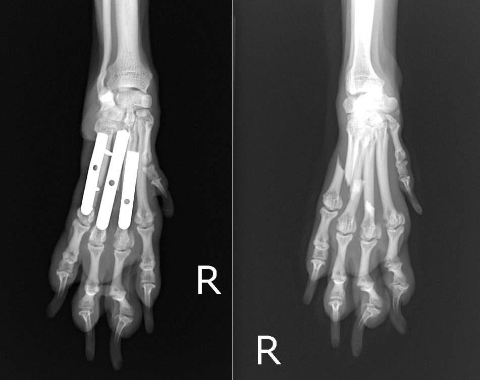 犬の中手骨骨折(1.1mmプレート使用) 左:術後/右:術前