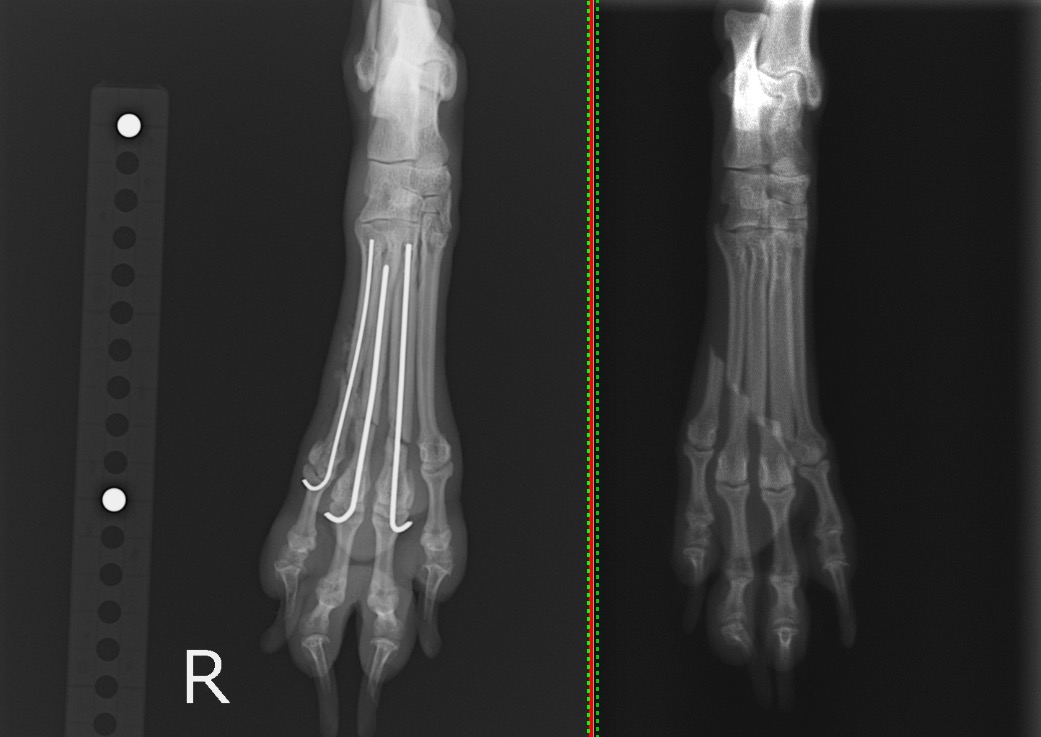 犬の中足骨骨折(0.6mmピン、0.8mmピン使用) 左:術後/右:術前