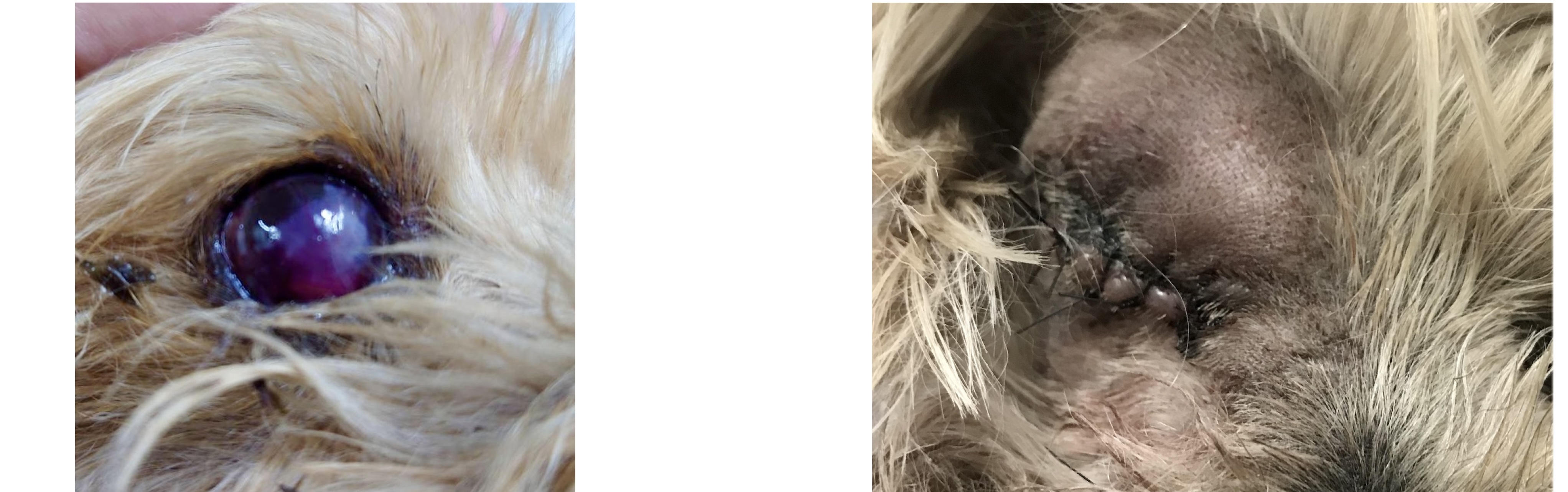 今回紹介する症例は、13歳、去勢オスのヨークシャーテリアです。右眼の視覚がなく、眼球摘出の手術を希望して来院されました。眼圧は左眼が14mmHg、右眼が47mmHgであり、右眼は正常値の10-20mmHgを超えていました。既に右眼は失明していたことから、疼痛軽減を目的として眼球摘出を行うこととなり、当グループ病院にて手術を実施しました。