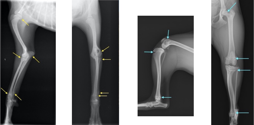 単純X線画像検査上、側面像では大きな左右差は認められませんでしたが、背掌像にて右前肢の軟部組織の腫脹と成長板の間隙が広くなっていることから橈骨遠位成長板骨折(Salter-Haris Type1)と診断し、外科的処置を行いました。 初心時のX線画像検査初見 赤矢印:軟部組織の主張、黄矢印:橈骨遠位成長板(左前肢と比較すると、成長板の隙間が広くなっております)