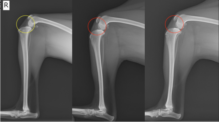 犬の免疫介在性関節炎の診断には、一般身体検査をはじめ、血液検査、X線検査、関節液検査(顕微鏡検査や細菌培養検査)、抗核抗体(ANA)検査、犬リウマチ因子測定など様々な検査を実施する必要があります。左側)健常な肢:膝蓋骨・膝蓋靱帯の下に膝蓋下脂肪体が存在 中央・右側)免疫介在性関節炎症例の肢:関節包の腫脹により膝蓋下脂肪体が圧迫されている所見(Fat Pad Sign)
