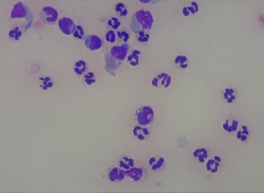 免疫介在性関節炎症例における関節液顕微鏡所見:変性のない好中球を多数確認